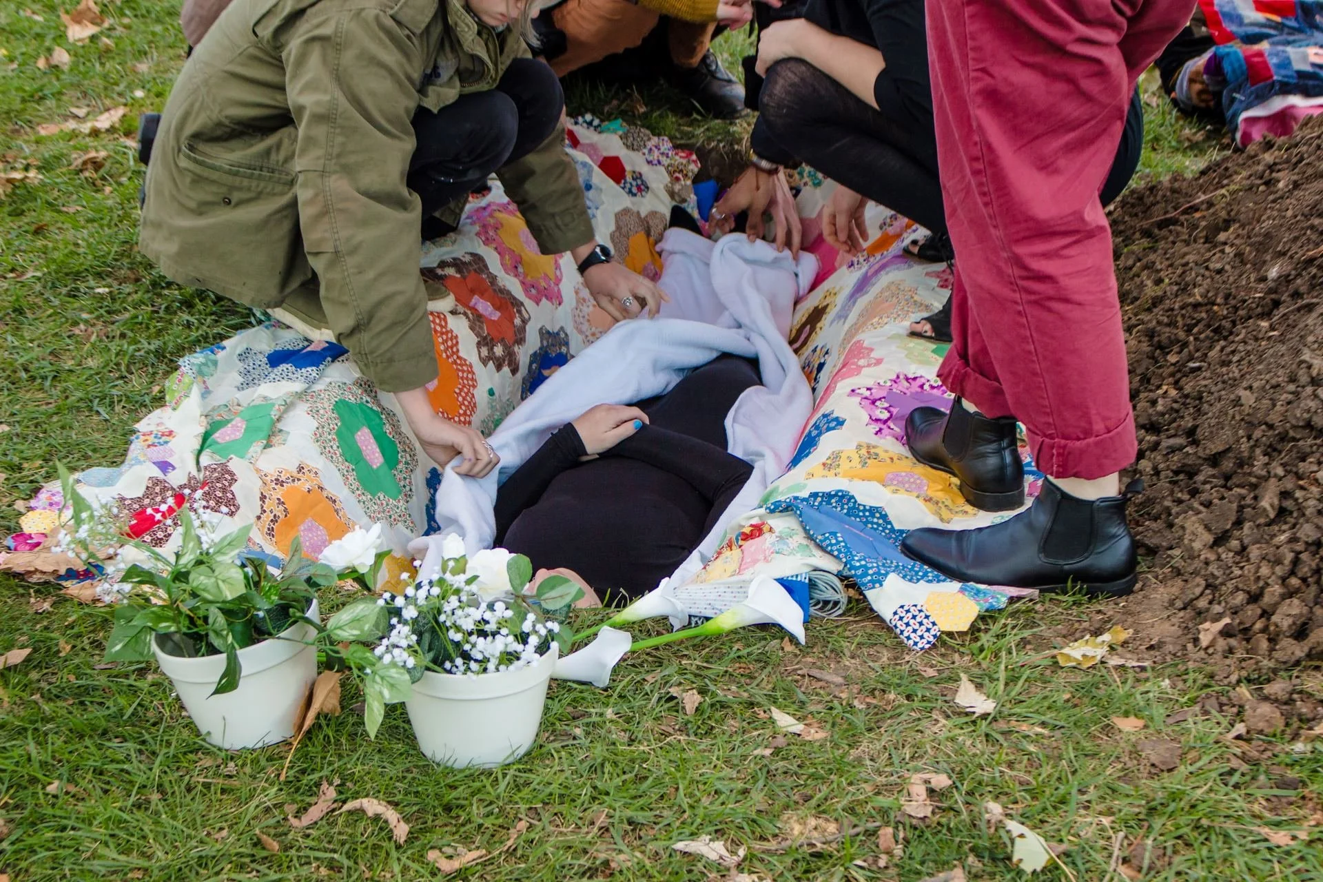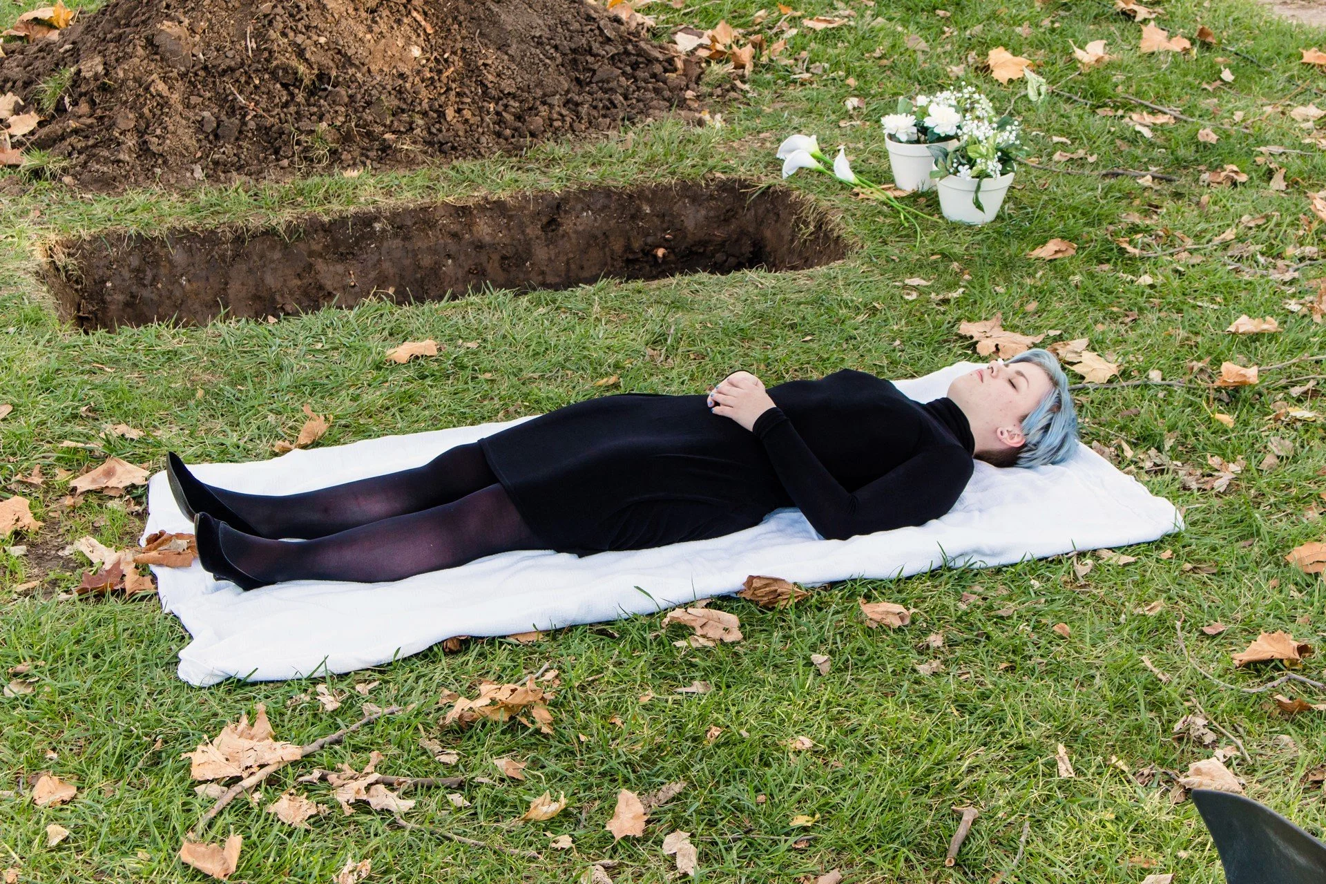 Because instructions were delivered through a pre-recorded video, and because they were interacting with a “corpse,” the guests had to make decisions based on their understanding of my comfort from previous interactions. The outcome of the performance relied on their decision making: I stated that once the video ended, I would be in their hands, and the audience was left with my body next to a grave and a set of blankets.